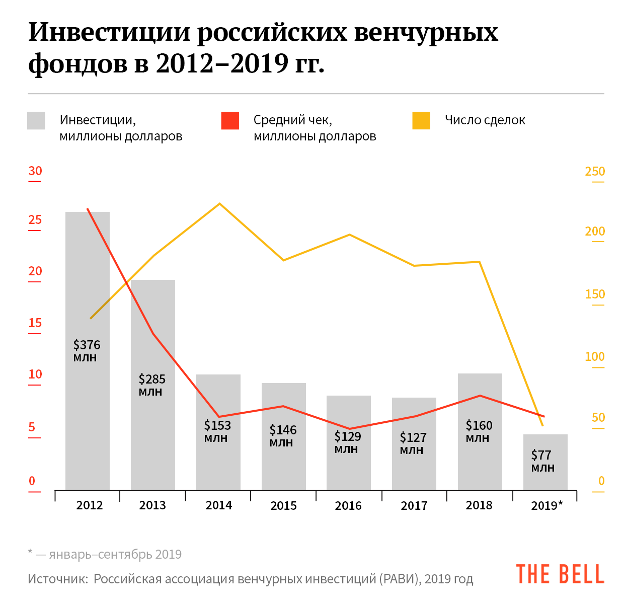 Рубеж 2000-х и 2010-х — время становления российского венчурного рынка. Начиналось десятилетие блестяще. В 2012 году только частные венчурные фонды вложили в стартапы $376 млн. Общий же объем сделок превысил $1,2 млрд. В Европе больше денег стартапы привлекли только в Великобритании. Но время больших надежд закончилось в 2014 году — с присоединением Крыма, падением цен на нефть и новым кризисом в экономике. Оправиться венчурный рынок не смог до сих пор.