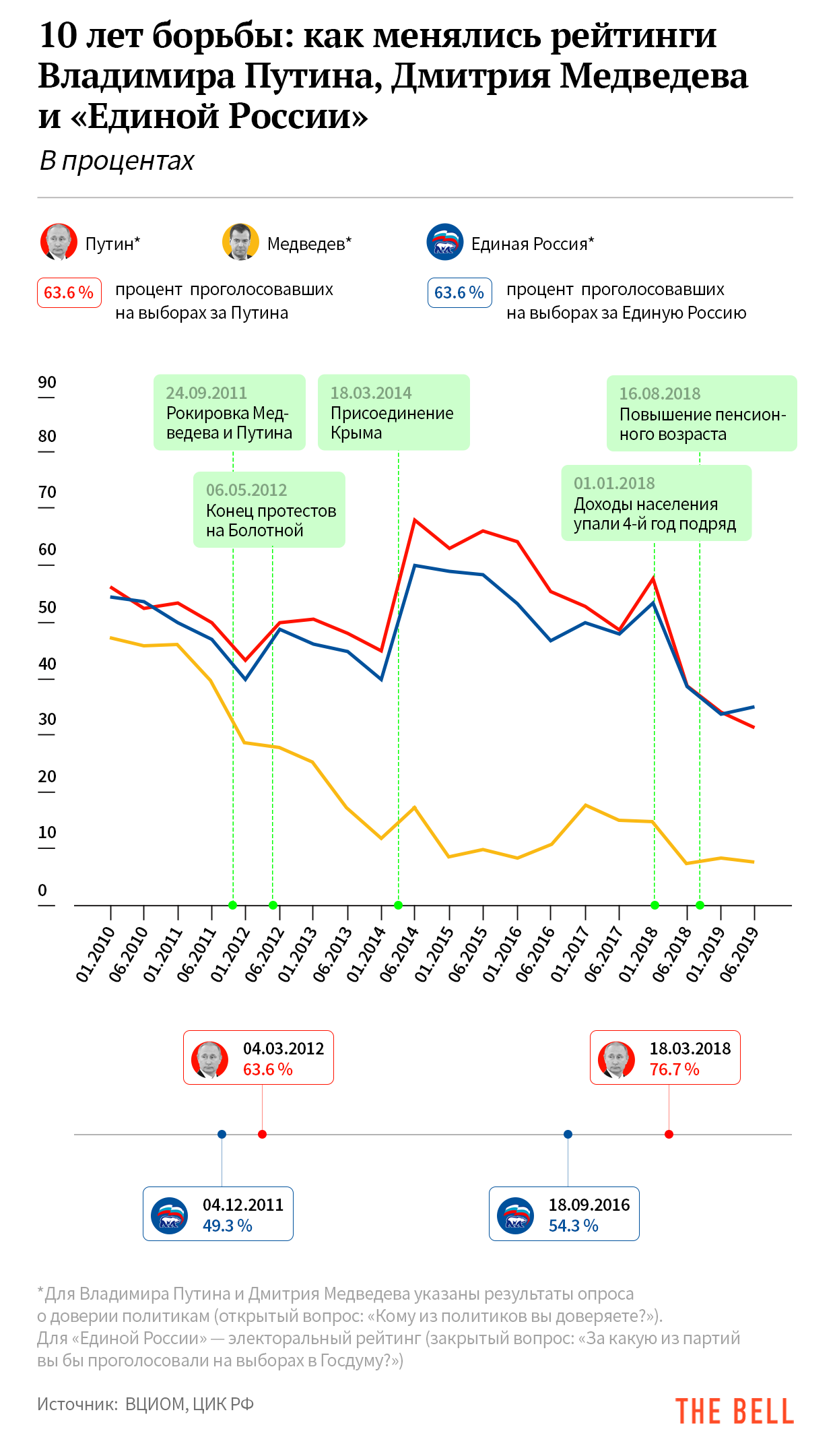 Конец 2000-х российская власть встречала с оптимизмом: экономический кризис преодолен, стабильности системы ничто не угрожает, 45-летний президент ездит с визитами в Калифорнию. Но уже с начала 2011 года график популярности Владимира Путина, Дмитрия Медведева и вверенной им «Единой России» начинает отражать непростую борьбу за рейтинги. Для россиян за эти десять лет она обернулась почти полным запретом на несогласованное с властями участие в политической жизни страны.