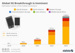 Число мобильных устройств с 5G, прогноз до 2023 года. Источник: Statista.