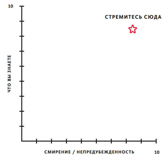 Чтобы получить представление об этой простой концепции, оцените по шкале от 1 до 10 ментальную карту человека (иными словами, что он знает) — это значение по оси Y, и то, насколько он обладает смирением/непредубежденностью — это значение по оси Х, как показано на рисунке на соседней странице.