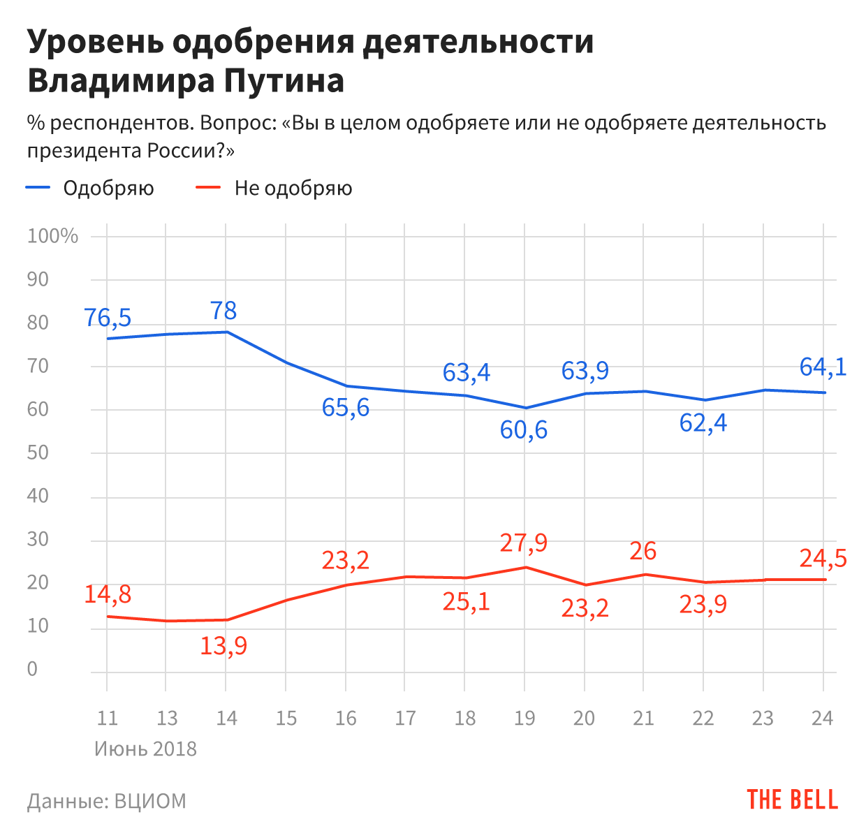 - По последним (на 24 июня) данным государственных социологов из ВЦИОМ, всего за две недели с момента объявления о реформе уровень одобрения работы Путина упал на 14 пунктов — с 78% до 64%. В последний раз рейтинг Путина был таким низким в январе 2014 года, а таких резких разовых падений не было даже в 2011 году, когда рейтинг Путина был минимальным (ниже 55%).