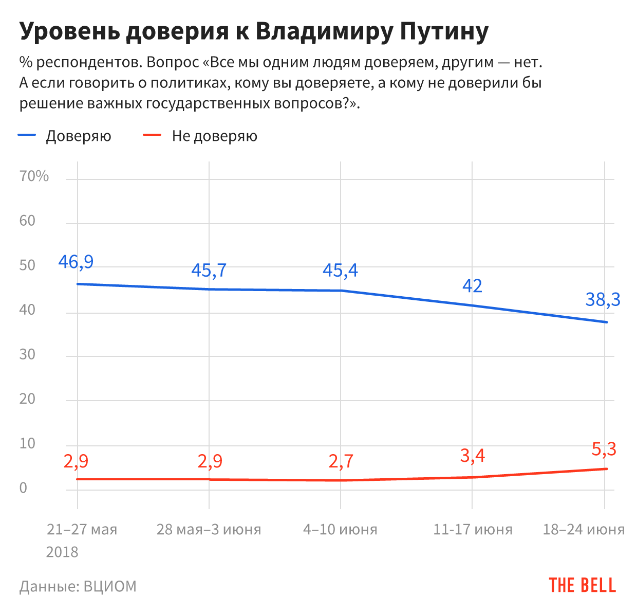 - «Снижение [рейтингов Путина и правительства] продолжалось несколько дней, после чего рейтинги стабилизировались на новом, более низком уровне», — говорится в комментарии ВЦИОМ. Это подтверждают и подробные цифры ВЦИОМ: пика падения (60,6%) рейтинг одобрения Путина достиг 19 июня, и с тех пор вырос на 4 пункта.