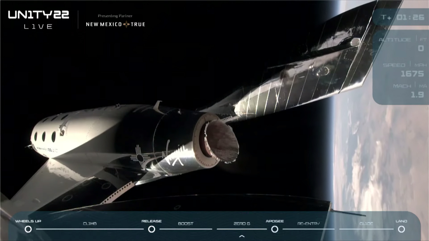 Ракетоплан VSS Unity отправился в суборбитальный полет на высоту около 88 км. Изначально запуск был запланирован на 16:00 по московскому времени, однако старт был отложен на полтора часа из-за погодных условий.