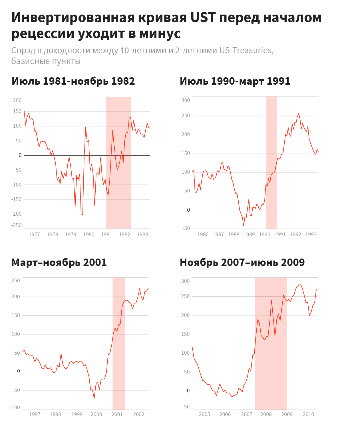 Последний раз признак будущей рецессии в виде инверсии кривой доходности наблюдался в декабре 2018 года — тогда отрицательным стал спред между двух-трех- и пятилетними госбумагами. Но аналитики говорили, что и эта кривая — не самая показательная.