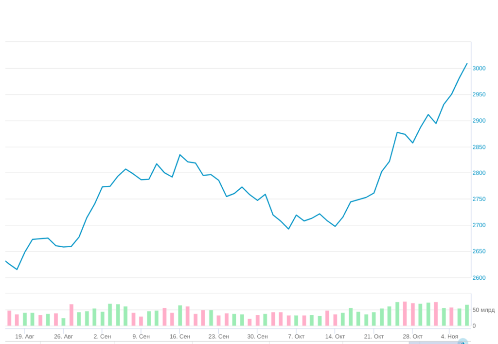 У инвесторов в российские акции праздник: рынок переживает подъем, а индекс Мосбиржи впервые в своей истории перешагнул за отметку в 3000 пунктов. Активная фаза роста началась с 1 октября, с 24-го числа рынок каждый день обновляет рекорды, а всего за месяц прибавил больше 9 п.п. Рассказываем, с чем связано ралли и стоит ли пытаться на нем заработать.