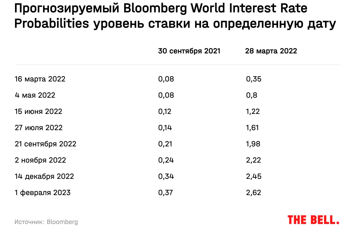 Ставки по двухлетним трежерис выросли с 0,2% в сентябре 2021 года до нынешних 2,3%. Причина очевидна — рынки теперь ожидают гораздо более быстрого роста ставок ФРC, что негативно сказывается на стоимости прежде всего коротких бумаг. Если 30 сентября медианный прогноз по ставке на февраль 2023 года составлял 0,37%, то теперь — 2,62%.