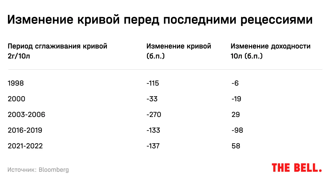 В прошлый вторник, впервые с августа 2019 года, доходности двухлетних американских казначейских облигаций (трежерис) превысили доходности десятилетних. Это знаковое событие: инверсия кривой доходности, то есть превышение краткосрочных ставок над долгосрочными, именно по этим бумагам считается самым надежным опережающим индикатором возможного наступления рецессии в американской экономике, отмечает редактор Bloomberg Джон Отерс.