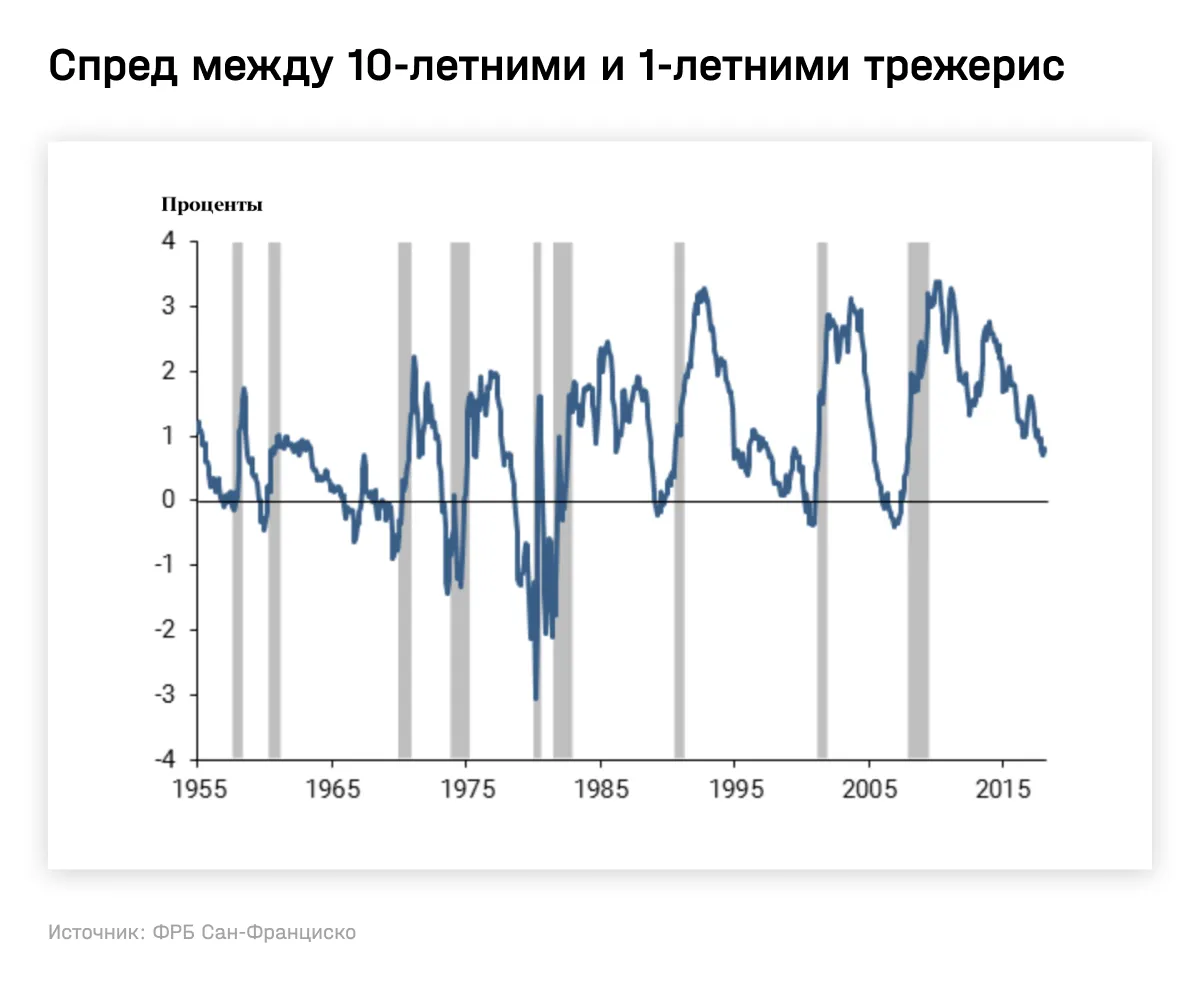 Начиная с 1955 года каждой рецессии в США с лагом от 6 до 24 месяцев предшествовала инверсия кривой доходности между долгосрочными (10-летними) и краткосрочными (1-летними) трежерис, говорится в исследовании Федерального резервного банка (ФРБ) Сан-Франциско. Единственный «ложный сигнал» был в 1998 году.