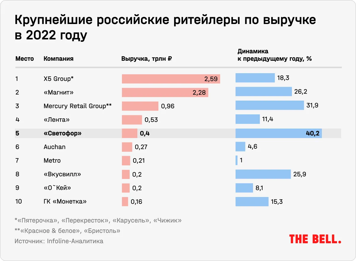 В 2022 году «Светофор» получил в России совокупную выручку 409 млрд рублей, что на 40,2% больше, чем годом ранее, оценило агентство «Infoline-Аналитика». Быстрее росли только онлайн-маркетплейсы Ozon и Wildberries. Органический рост «Светофора», впрочем, замедлился: в прошлом году открылось 465 точек против 1200 годом ранее, а еще несколько сотен магазинов закрылось. Но сеть все равно вошла в топ-5 крупнейших продуктовых ритейлеров по обороту: после X5 Group, «Магнита», Mercury Retail Group («Красное & Белое», «Бристоль») и «Ленты».