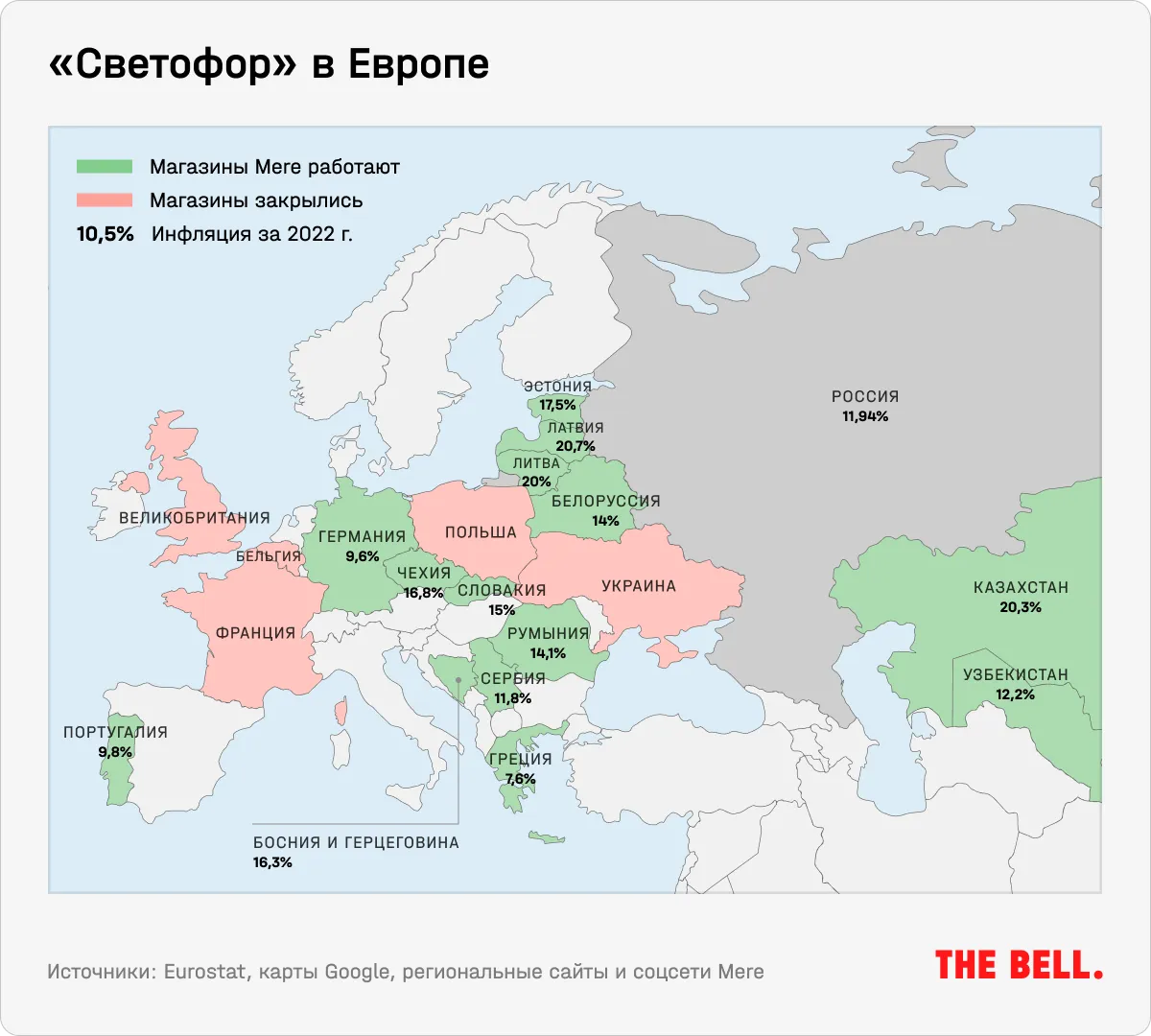 «Правила меняются каждый месяц, местные регуляторы пытаются выдавливать российский бизнес, часто вопреки общим правилам ЕС, арендодатели стали бояться сотрудничать, некоторые поставщики тоже, при этом со стороны рядовых покупателей спрос только растет, — говорит собеседник The Bell из Mere в одной из стран Балтии. — Но, если получится, будем все-таки открывать еще один магазин до конца года».