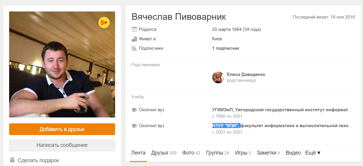 Профиль Вячеслава Пивоварника в "Одноклассниках"