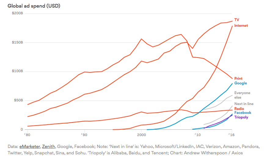 Утром мы писали о хороших новостях для американских медиа, но вообще-то эта неделя была как никогда богата на плохие. Здесь перечисляются они все: Buzzfeed и Vice (оба собираются на IPO) показали прибыль ниже прогнозов; основатели Mashable продали сайт холдингу Ziff Davis всего за $50 млн — на $200 млн дешевле, чем оценка, полученная в предыдущем инвестиционном раунде; в контентном подразделении оператора связи Verizon (владеет Yahoo!, AOL и Huffington Post) сокращают 560 человек. И это только начало: медиарынок только начинает накрывать кризис, который будет углубляться с ростом рекламных доходов Google и Facebook.