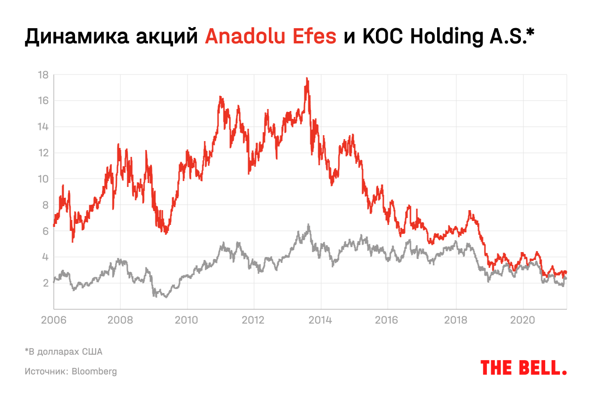 «Купить индекс» — самая простая и понятная возможность сделать ставку на восстановление турецкого фондового рынка. Но можно заняться и выбором конкретных акций. Несмотря на то что акции турецких банков выглядят очень дешево, я бы не стал покупать их прямо сейчас. На данный момент мне нравятся акции турецких компаний из реального сектора, и хорошо, если они ориентированы в значительной степени на экспорт. Например, это всем хорошо известный Anadolu Efes — компания занимается производством и продажей пива, солодовых напитков и продукции Coca-Cola как в самой Турции, так и в России, других странах СНГ, некоторых европейских странах и на Ближнем Востоке. Несмотря на хорошо диверсифицированный географически бизнес, акции компании торгуются на многолетних минимумах (в долларовом выражении), а дивидендная доходность на этом фоне превысила 8% годовых. Хорошей идеей для покупки выглядит KOC Holding A.S. — диверсифицированный холдинг, портфельные компании которого занимаются производством автомобилей, бытовой техники, электроники, текстиля, строительных материалов, продовольствия и других продуктов, а также доставкой сжиженного газа, страхованием, лизингом, брокерским и банковским бизнесом.