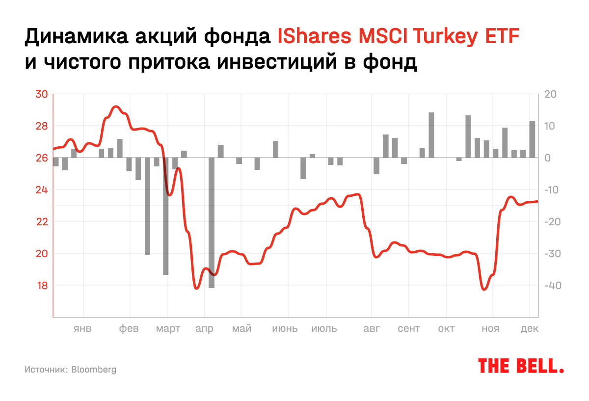 Некоторые международные инвесторы уже приступили к формированию позиций в турецких акциях. Самый простой способ сделать это — купить соответствующий ETF. Например, iShares MSCI Turkey ETF (см. рис. 5). Приток денег инвесторов в фонд начался еще в середине октября и на начало декабря продолжался уже восьмую неделю подряд. За этот период приток уже составил $46 млн при сумме чистых активов $272 млн.