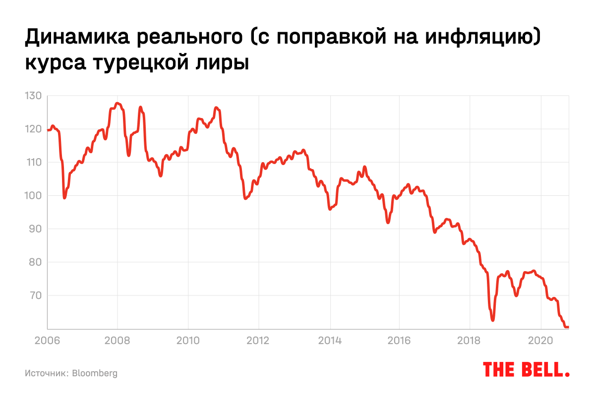 Даже в реальном выражении (с поправкой на инфляцию) лира находится на многолетних минимумах.