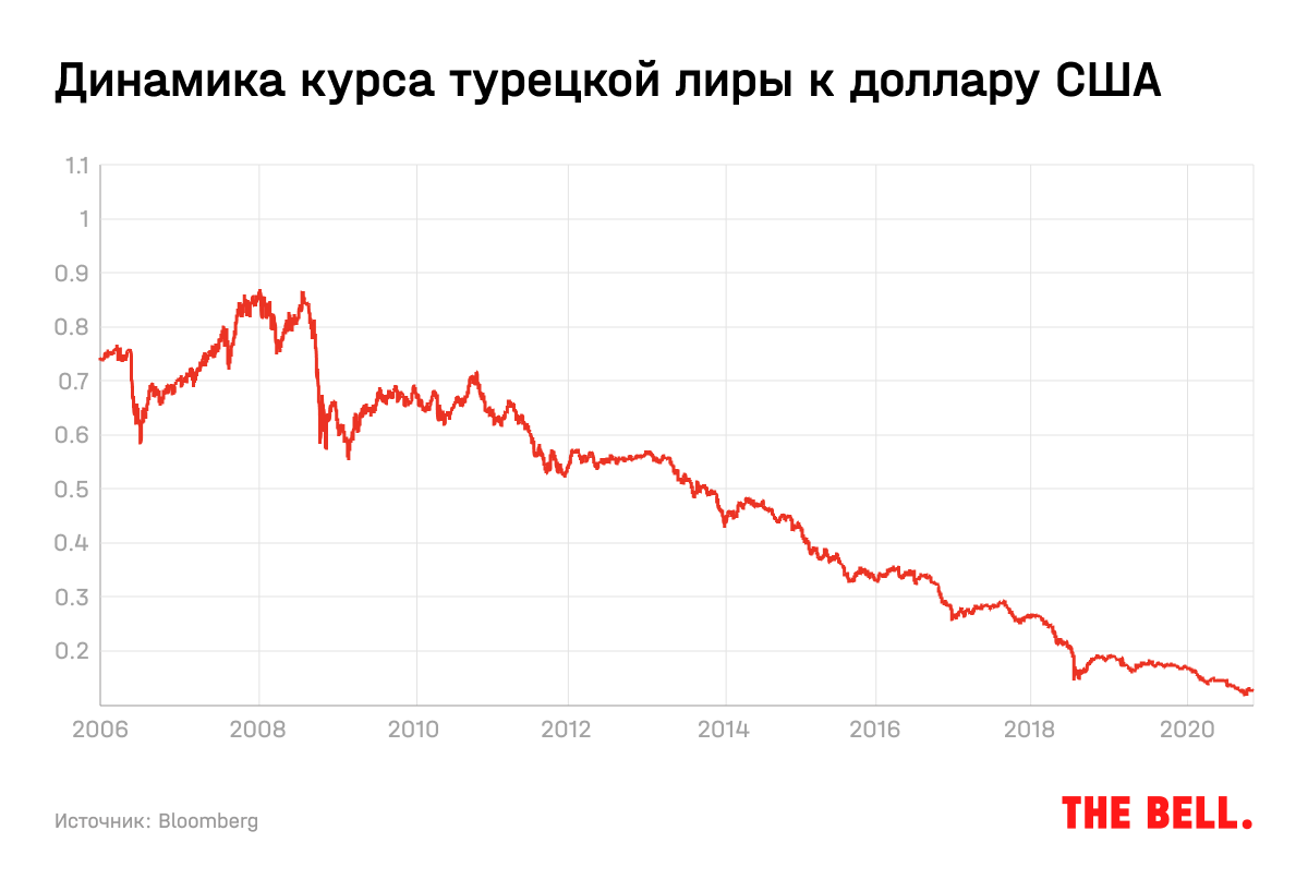 Одной из таких стран является Турция. Несмотря на достаточно диверсифицированную по отраслям народного хозяйства экономику и хорошие темпы роста ВВП, страна не отличается стабильностью как валюты, так и финансового рынка в целом. За последние 10 лет лишь в 2012 году курс турецкой лиры смог укрепиться к доллару — с тех пор лира дешевела каждый год, потеряв с 2013 года более 77% своей номинальной стоимости.