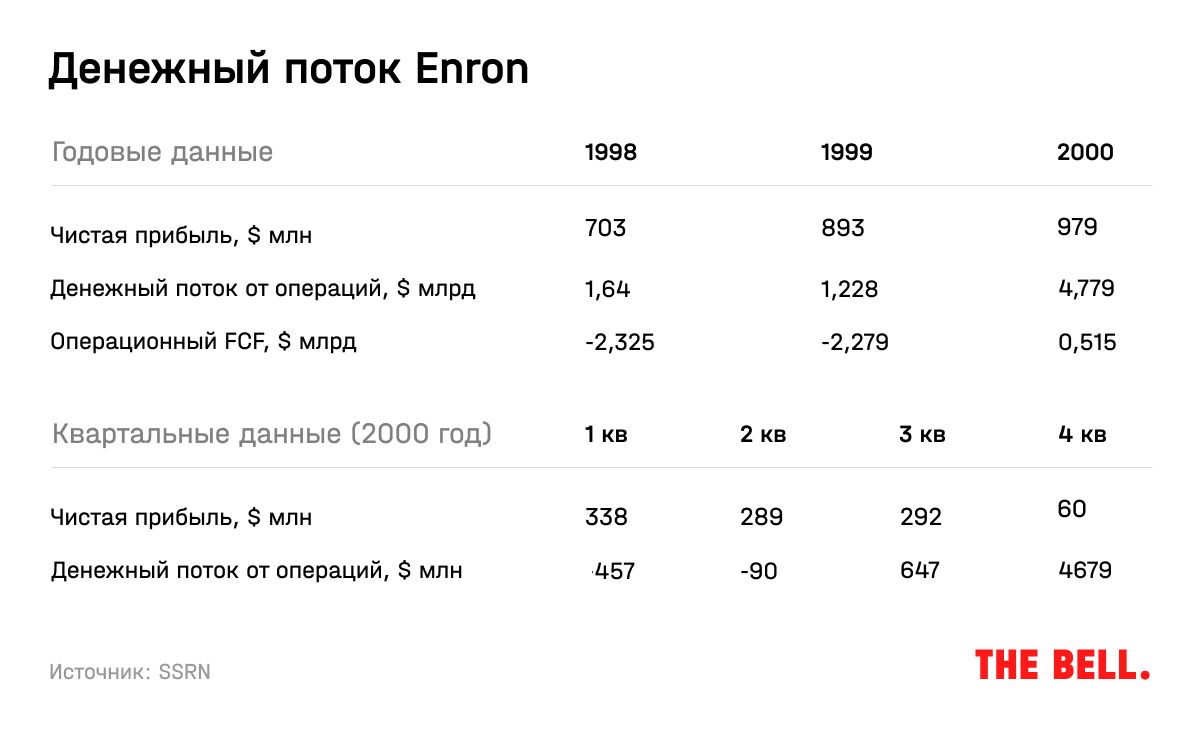 Но, пожалуй, самый важный показатель для инвесторов — свободный денежный поток (FCF, free cash flow). Это количество свободных денег в компании после уплаты налогов, процентов и капитальных затрат без учета привлеченных банковских кредитов. У Enron в 1995–1999 годах свободный денежный поток от операционной деятельности был постоянно отрицательным. В сочетании со снижающейся рентабельностью по чистой прибыли это должно было быть главным красным флажком для инвесторов, отмечают исследователи. «Никто не мог точно объяснить, как Enron зарабатывает [...], денежный поток компании от операционной деятельности, похоже, мало был связан с отчетной прибылью», замечал Джим Чанос из хедж-фонда Kynikos Associates, который, вероятно, первым обнаружил схемы Enron.
