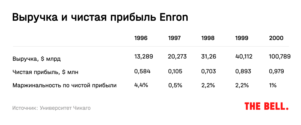 Выручка, которую компания позиционировала как свою главную бизнес-метрику, в 1996–2000-е годы росла на беспрецедентные среднегодовые 65% — и это при том, что сферы энергетики и коммунального хозяйства не относились к быстрорастущим даже тогда, пишут исследователи. Рост сектора на 2–3% в год считался хорошим показателем. При этом микроскопическая относительно выручки прибыль Enron росла в среднем на 16,9%.