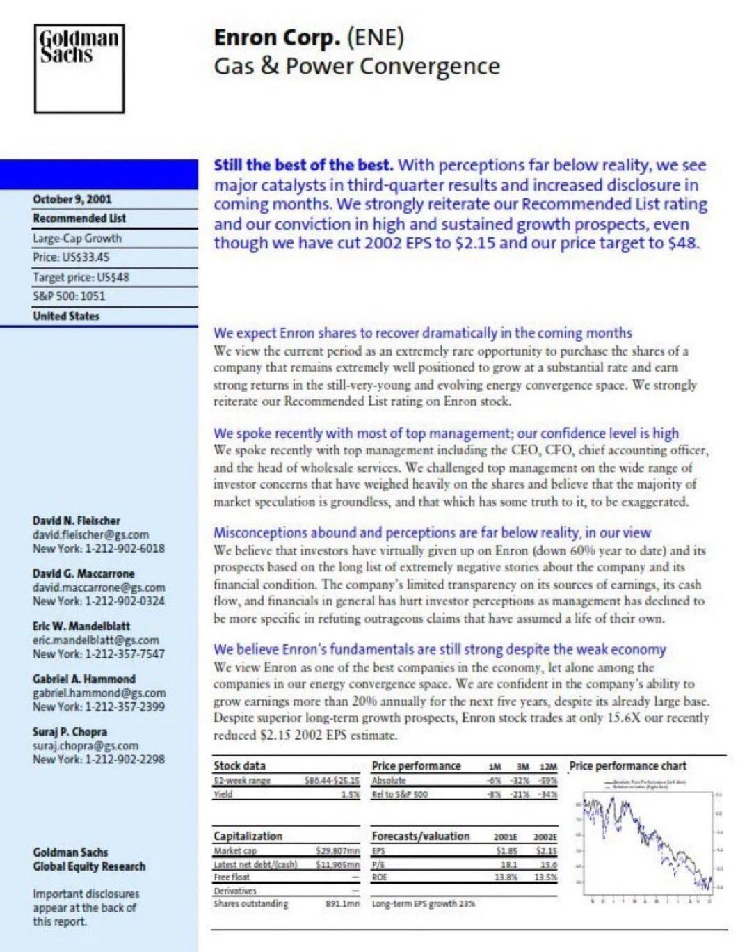 Частично роль козлов отпущения взяли на себя и на аналитики, выдававшие рекомендации по покупке акций. Многие из них до последнего позитивно смотрели на Enron. Например, Goldman Sachs всего за два месяца до банкротства гиганта выпустил ставший легендарным отчет с заголовком «Enron: по-прежнему лучший из лучших».
