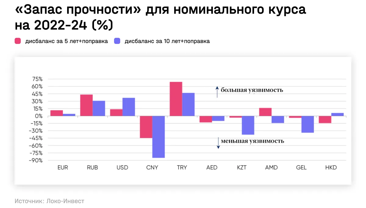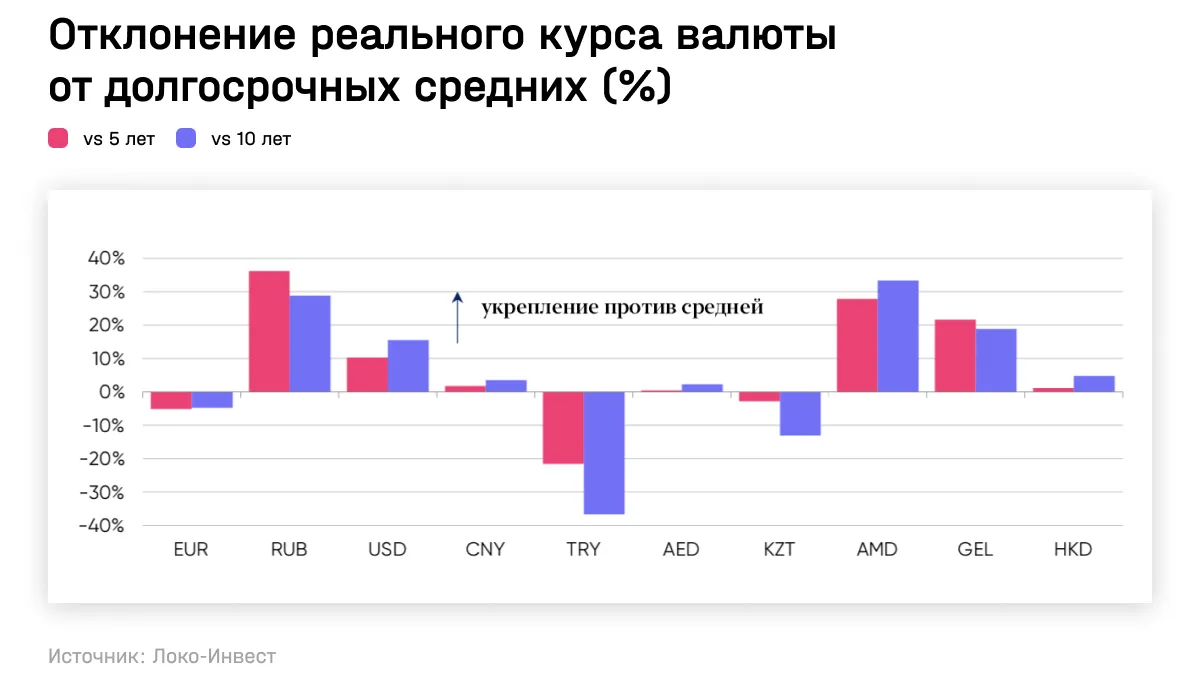С учетом динамики и масштабов отклонения реального курса валют от долгосрочных средних переоцененными выглядят рубль, драм и лари, также дорогим выглядит и сам доллар США. Меньше рисков у юаня, тенге и явного аутсайдера — турецкой лиры.