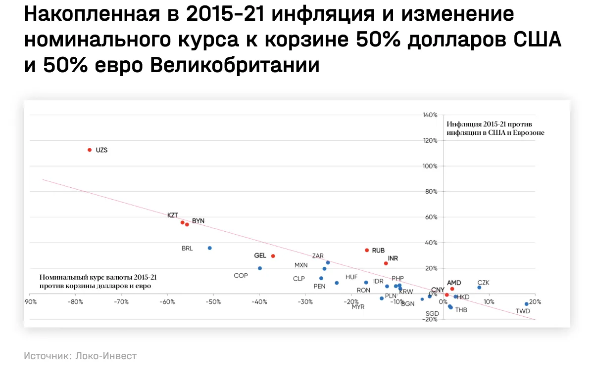 Так, чем более высока разница в ожидаемой инфляции относительно США и ЕС, тем более высоки риск номинального ослабления валюты к доллару США и евро из-за необходимости сохранения конкурентоспособности экономики. Эта корреляция прослеживалась и в 2015–2021 годах: аутсайдерами по изменению номинального курса валют к 50%/50% корзине из доллара США и евро из развивающихся стран стали Турция, Узбекистан, Казахстан и Беларусь.