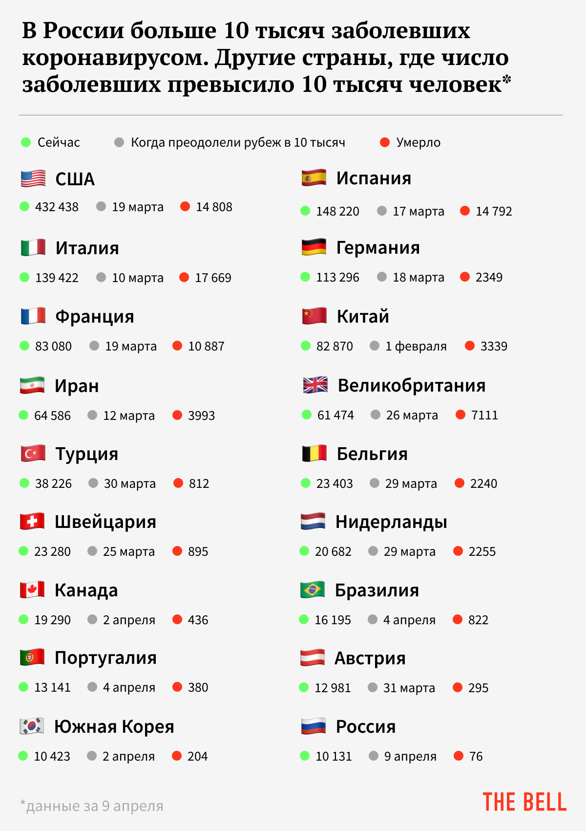 Количество зараженных в России преодолело отметку 10 тысяч только накануне. Мы сравнили статистику по России с другими странами по достижении этой цифры.