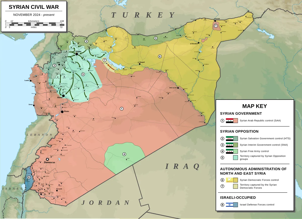 Наступление противников Асада из исламистского движения «Хайят Тахрир аш-Шам» началось в конце ноября — в тот же день, когда в Ливане вступило в действие перемирие между «Хезболлой» и Израилем. «Хезболла», как и покровительствующий ей шиитский Иран — главные союзники Асада, чья семья принадлежит к алавизму, направлению ислама шиитского толка. Противники Асада — сунниты, и им покровительствует главная суннитская сила региона — Турция.