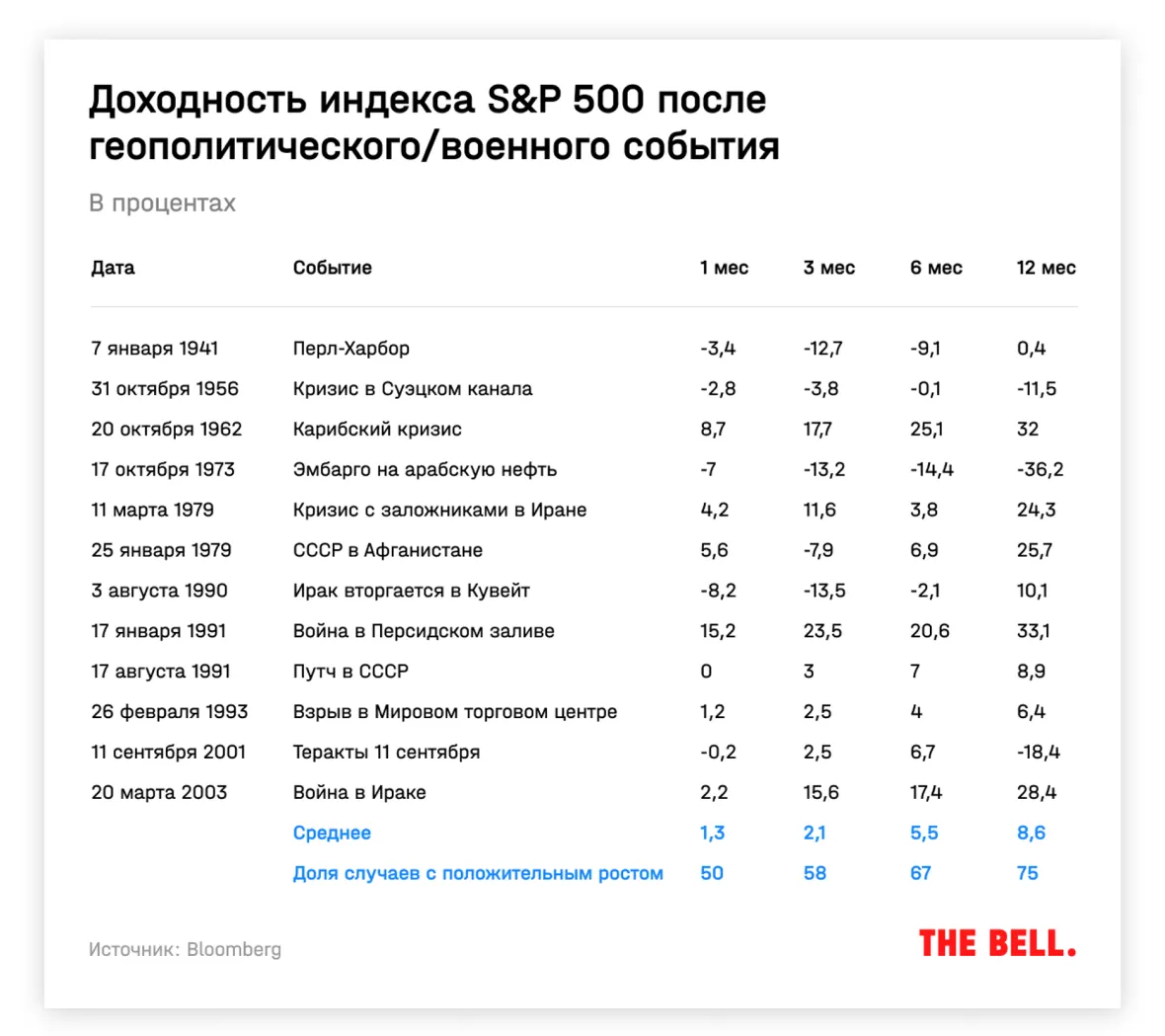 • В месяц после самого серьезного обострения холодной войны между СССР и США — Карибского кризиса 1962 года — S&P 500 вырос на 8,7%. Причина в том, что конфликт вокруг размещенных на «непотопляемом авианосце» Кубы советских ракет, грозивший ядерной войной сверхдержав, тогда разрешился на удивление быстро. В западной историографии принято считать это чистой победой США и унижением СССР. Современные ревизии обращают больше внимания на торг Никиты Хрущева с Джоном Кеннеди и секретное соглашение о выводе американских ракет из Турции и Италии — как и на то, что США сильно недооценили серьезность восприятия американской угрозы руководством СССР.