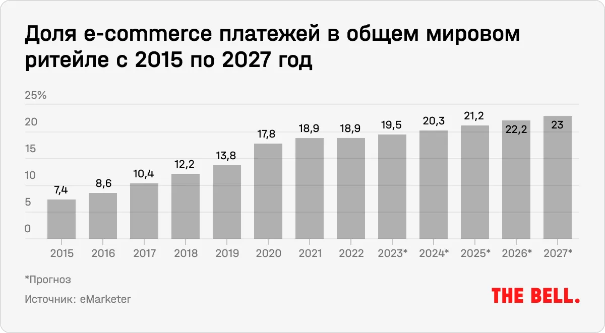 Бум электронной коммерции, вероятно, позади, а период роста сменился стагнацией и ужесточением конкуренции, пишет The Economist. В 2020-м во время пандемии доля e-commerce в общем объеме мирового ритейла, согласно исследованию eMarketer, выросла сразу на 4 процентных пункта. Необходимость переводить значительную часть расходов в онлайн заставила ритейлеров развивать сегмент доставки и убедила инвесторов, что и после пандемии люди продолжат совершать покупки в интернете — это разогнало акции e-commerce компаний до исторических пиков.