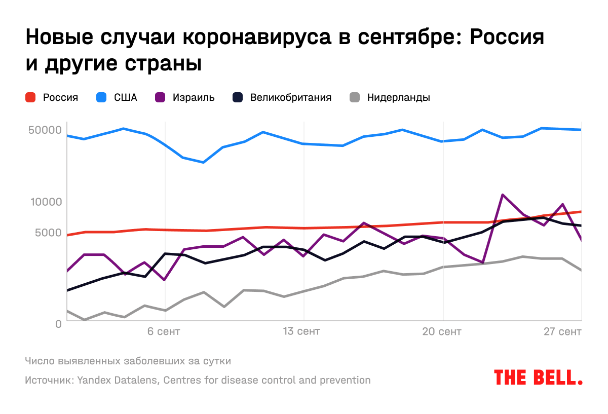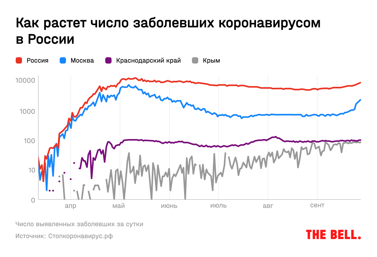 Тамм предполагает, что резкий рост числа заражений в Москве в сентябре может быть обусловлен тем, что «московские власти решились — или им разрешили — вернуться к честному информированию о положении вещей». Собеседник The Bell, знакомый с ходом обсуждения в мэрии, говорит, что цифры заболеваемости по Москве действительно решили «отпустить» — чтобы люди серьезнее относились к ограничительным мерам.